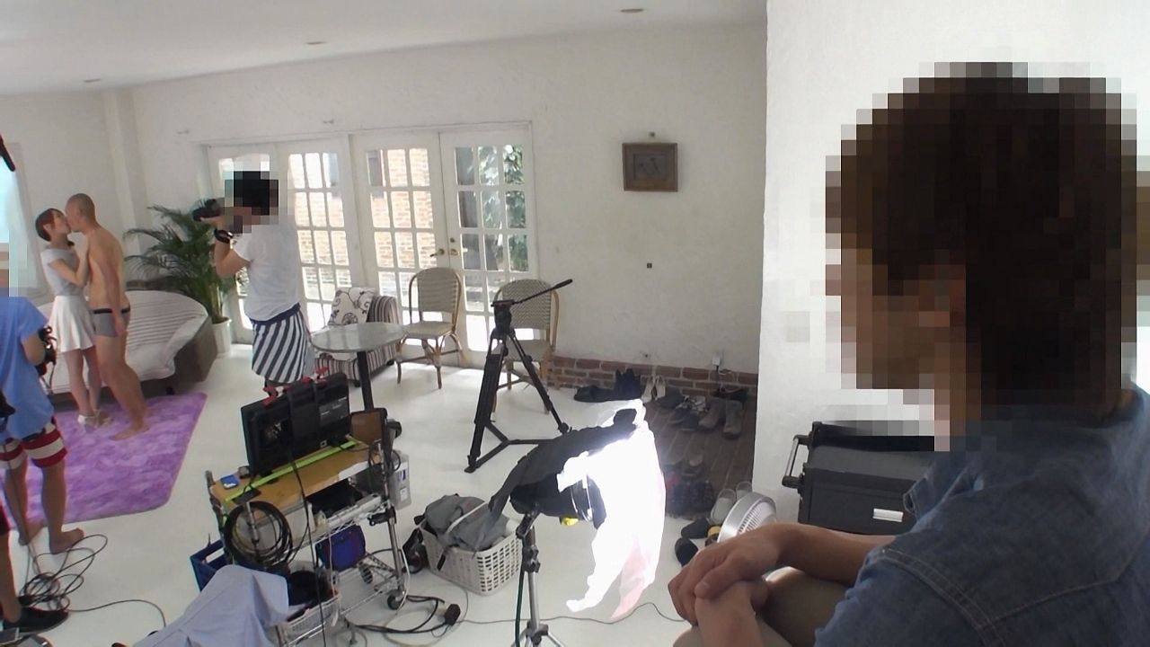私服での打ち合わせ風景。特に企画も思いつかず、彼氏の話題に。彼氏との関係はイマイチ上手くいってないようで、個別でオナニーして性的欲求を解消している状態だと言う。という事で、彼氏に愛華みれいのAV撮影現場を見学してもらう企画が生まれた。
