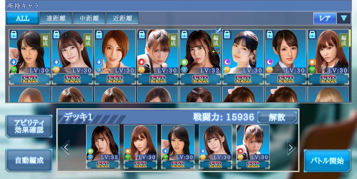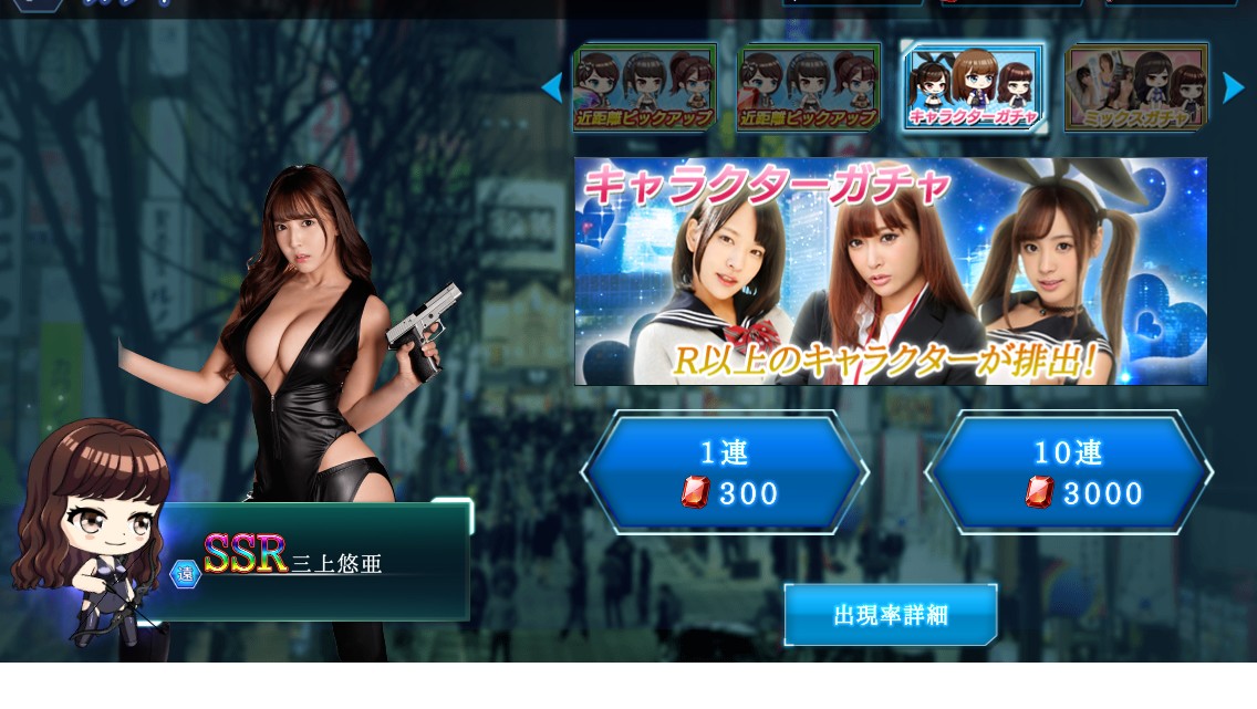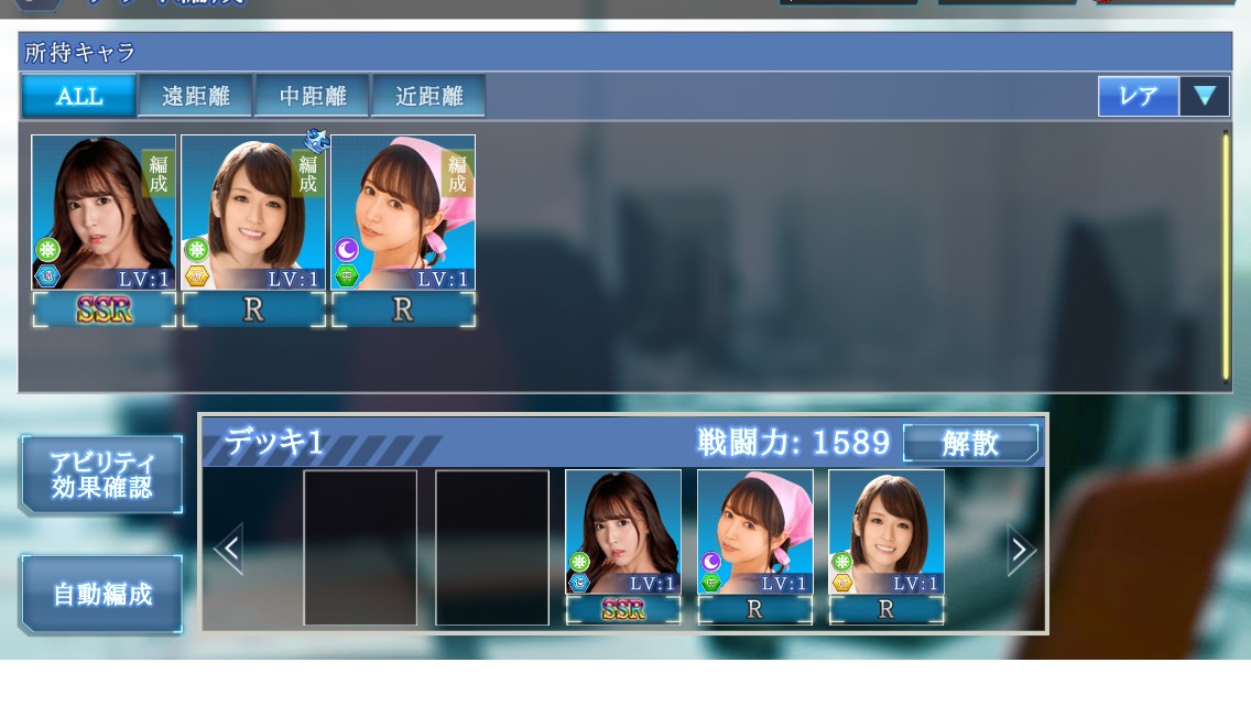 キャラクターのポジションは近距離/中距離/遠距離があります。ちなみに三上悠亜は遠距離、篠田ゆうは中距離、椎名そらは近距離でした。キャラクターごとに決まっており、変更はできないみたいです。