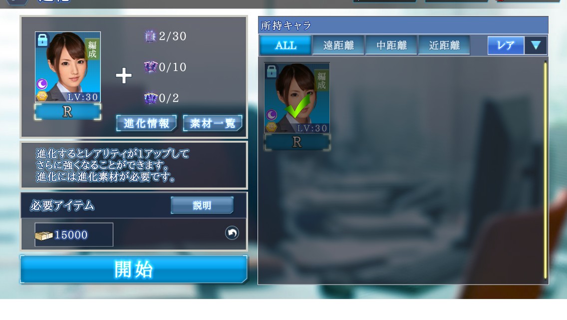 RからSRなどへの進化は、「キャラクター」→「進化」からレベルを最大(30)にしたキャラクターに必要な進化素材を消費しておこなう。