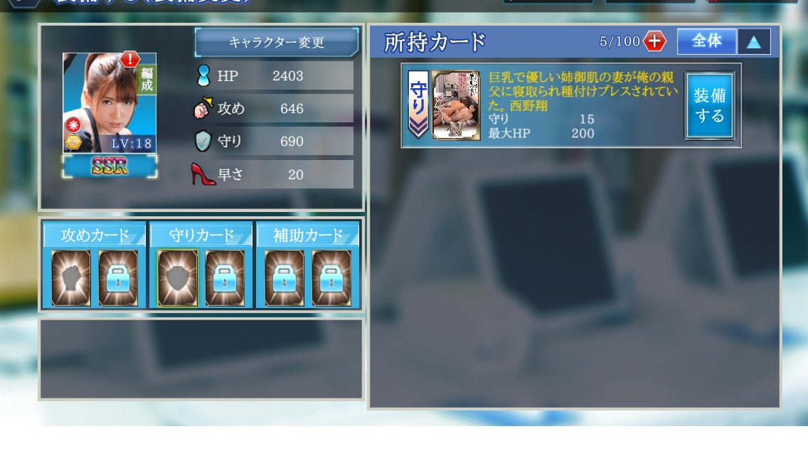 装備アイテムはカード。攻めカード、守りカード、補助カードの3種があり、キャラクターごとのスロットに装備する。
