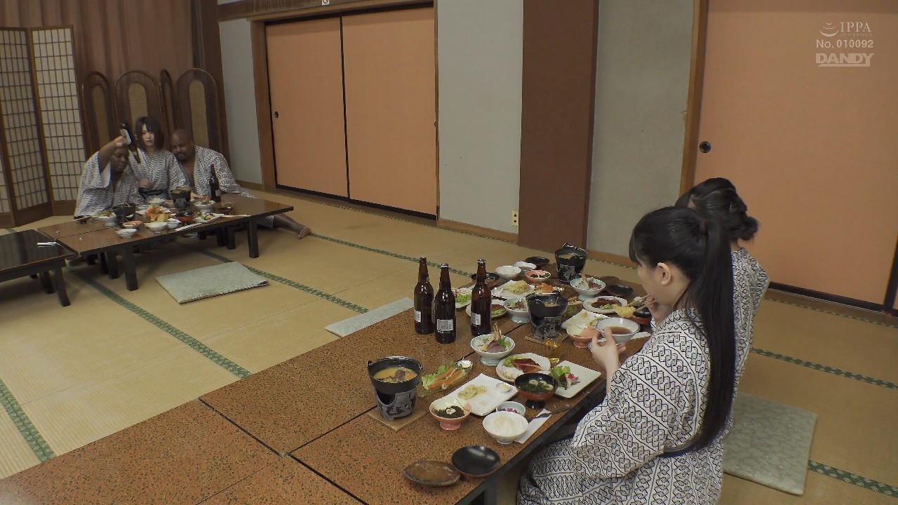 旅館の大部屋で、みひな、妃月るい、羽田希が浴衣姿で食事中。