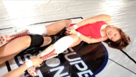 北川瞳が再びコブラツイストの後に男を寝かせて脚で首を絞める。これは絞められている方も気持ち良さそう。