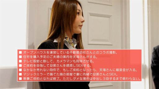 「某不動産完全協力」という事で7000万円の分譲中古住宅を販売できれば天海つばさが手数料を貰えるという企画。販売するためにラブラブの夫婦の夫を誘惑すると。さすがにガチなわけないですから、あくまでこういうシチュエーションを楽しむものです。