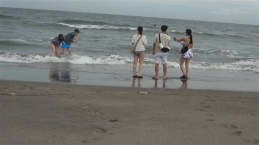 ロケ地のビーチに到着して、おおはしゃぎ。