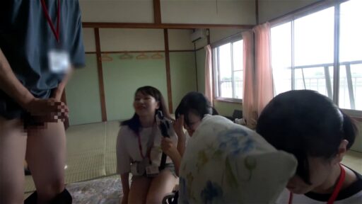 急に勃起チンポが出てきて顔を隠す吉井彩葉と向井保奈美、普通に見ちゃう西野心音。