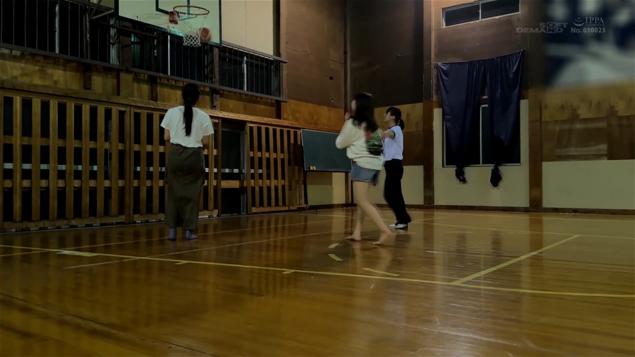体育館でバスケをして遊ぶ6人。女子2人はバスケ経験者。