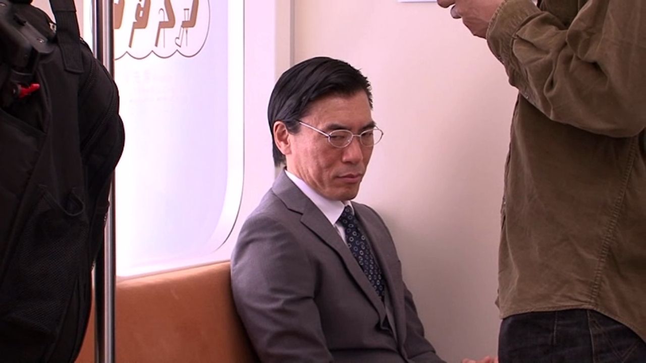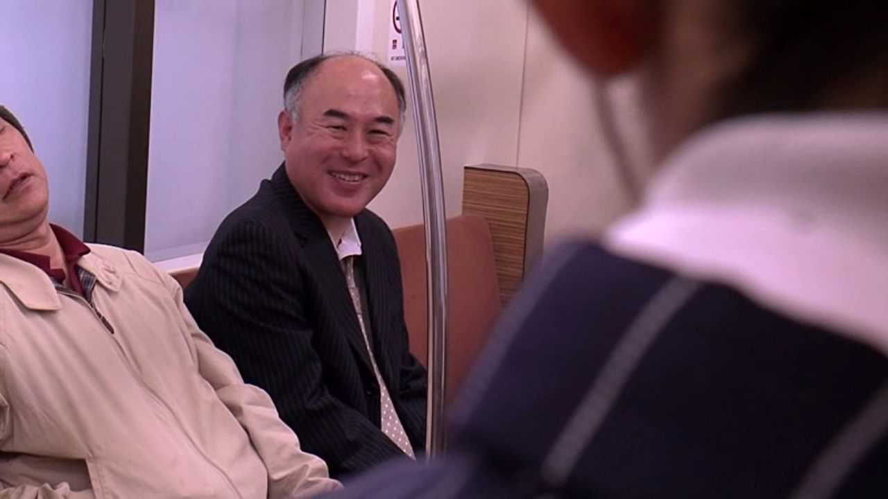 痴女っぽい格好で電車に乗る相内つかさ。遠くから見つめる謎の男。