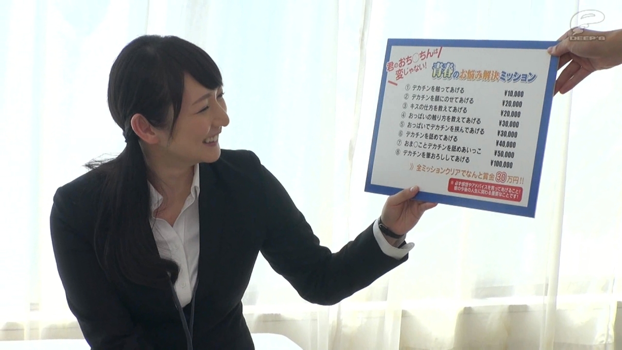 巨乳人妻OLがデカチンに悩む童貞君の相談に乗ってあげる企画。ミッション制で手順を踏んで最後は筆おろしという展開。シリーズ『3』なので定番の展開。