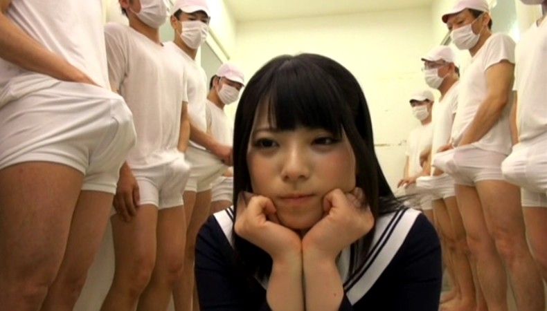 廊下に並んだ男たちのチンチンをチェックし、上原亜依「みんなオチンチンおっきいし どのオチンチンも すごい気持ち良さそうだし うーん どのオチンチンか選べないや ねぇ みんなが亜依のところに来て」