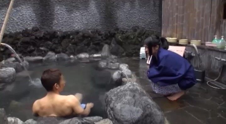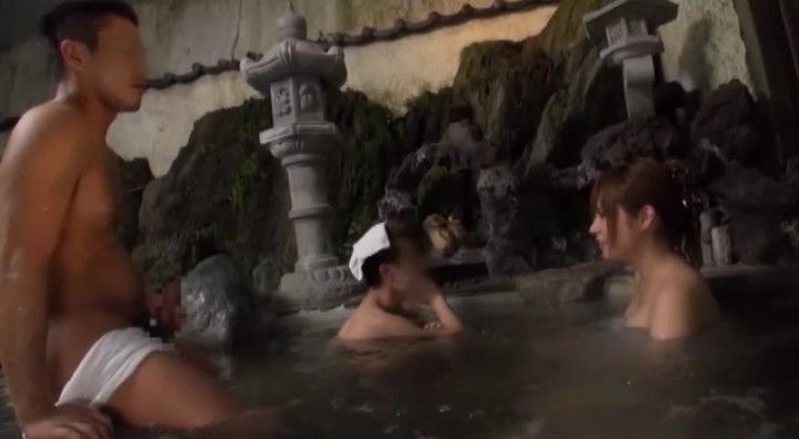 カップルが温泉に入っているところに、もう1人別の男が入ってくる。