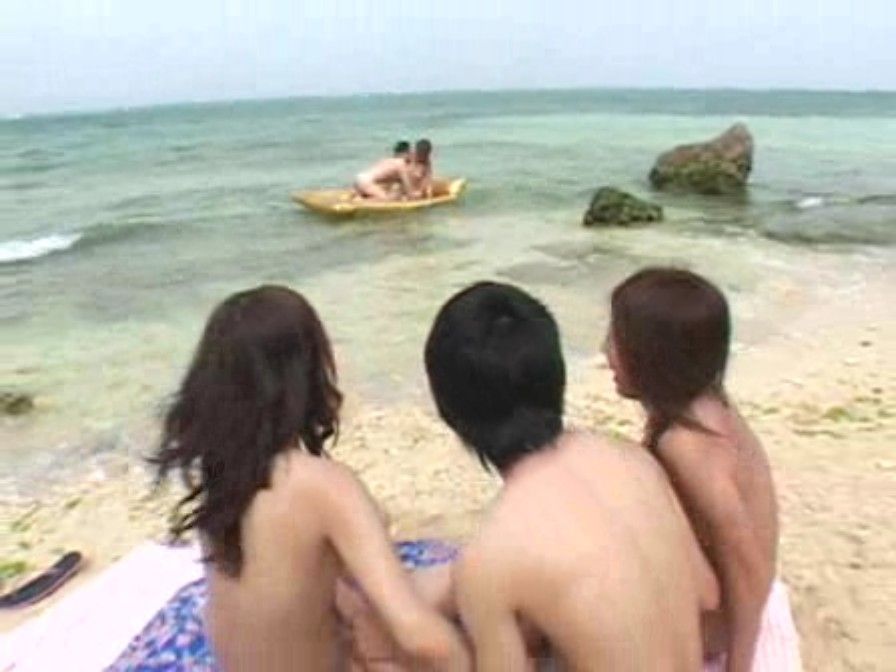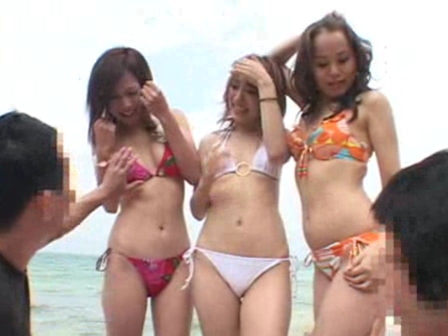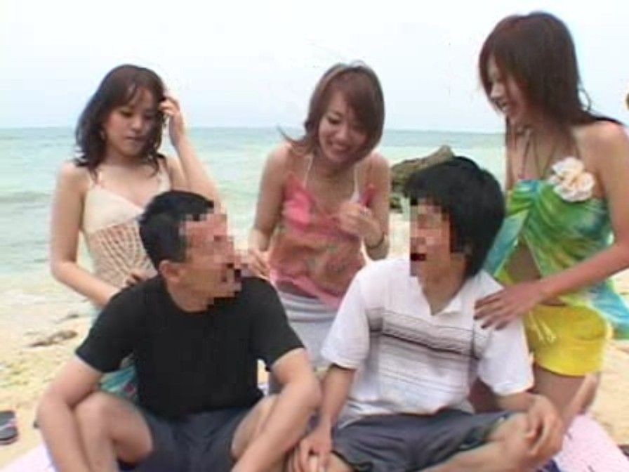 沖縄で3人組の水着ギャルが逆ナンパ。ゲットした2人組は25歳と20歳で会社の先輩後輩。先に後輩が騎乗位で挿入し、後から先輩も並んで騎乗位をするが、あっさりと先に射精してしまった先輩。