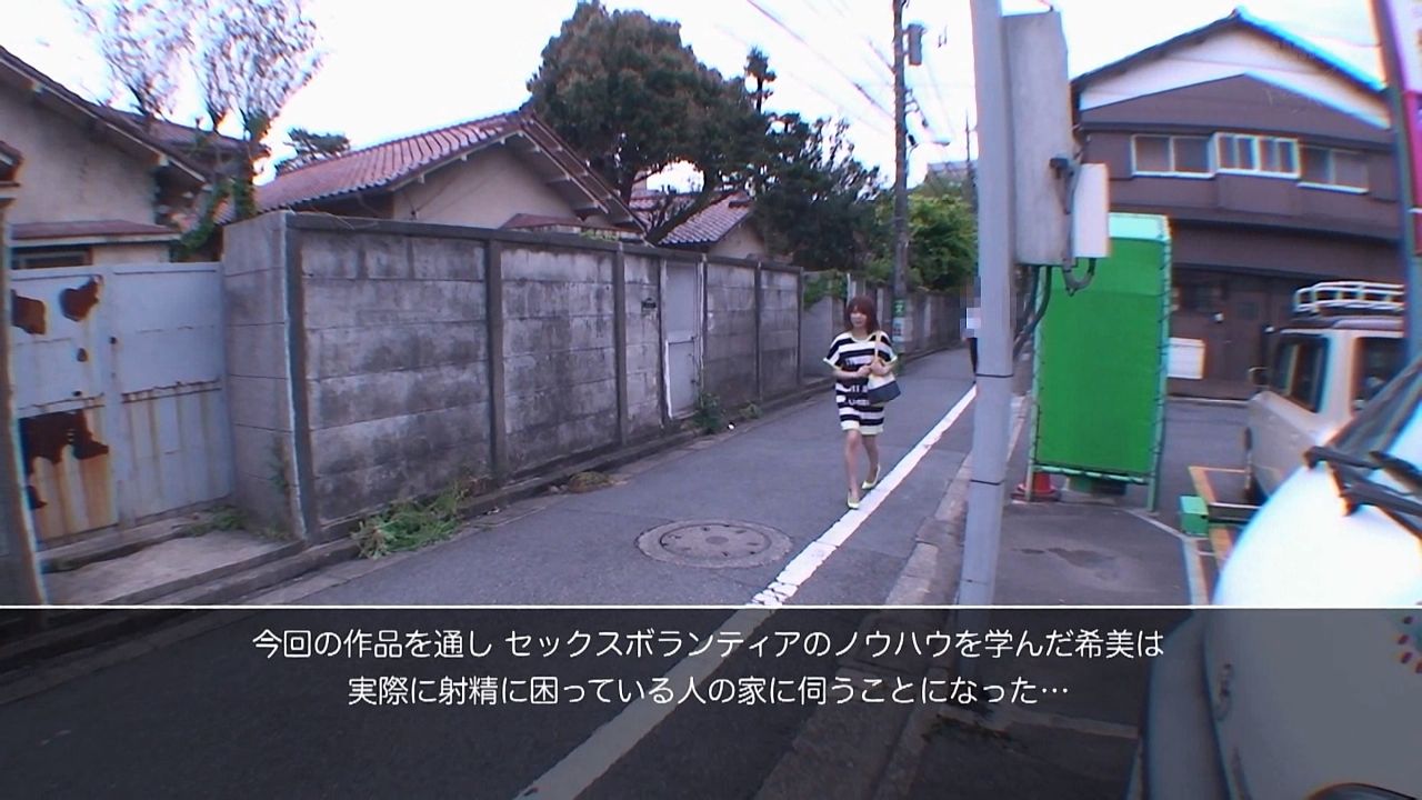 性に困っている人を助けるセックスボランティア。シーン1では早漏に悩む男性を無理矢理引っ張って早漏改善トレーニング。手コキをしているとノーカットジャスト2分で射精。話をしながらの軽めの手コキでしたが、ドラマ撮影というシチュエーションの中、2分で発射できた男優がスゴイ。